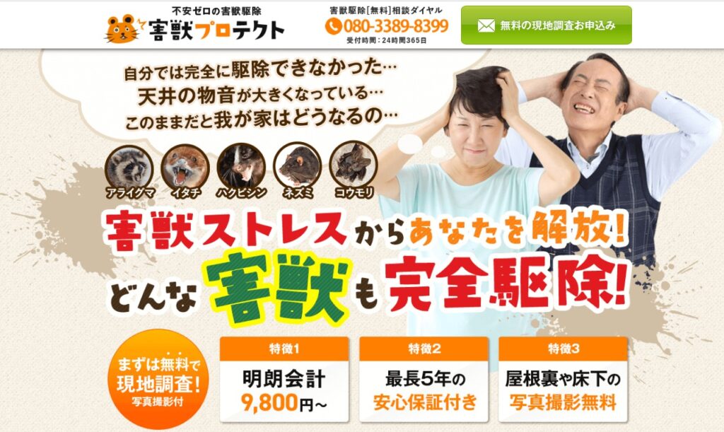 「害獣プロテクト」は無料調査で屋根裏や床下を写真や動画で詳しく確認し、見積後は追加料金なしの明朗会計が特長。